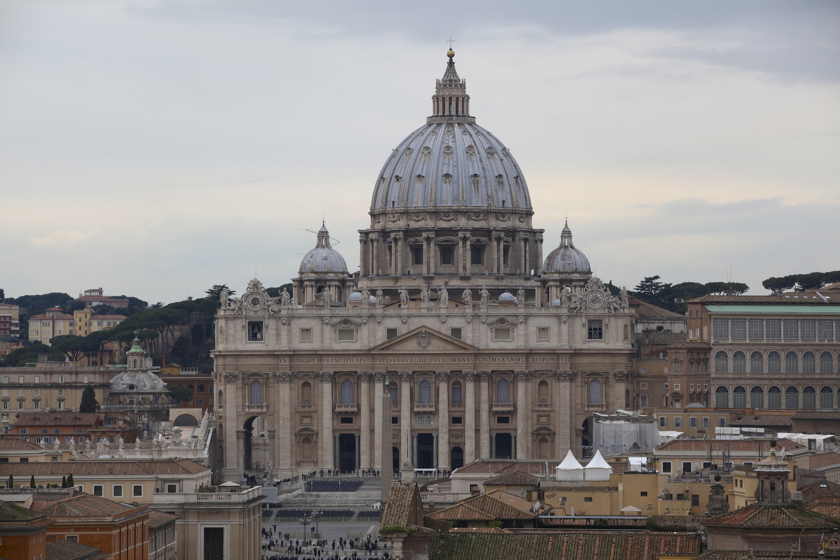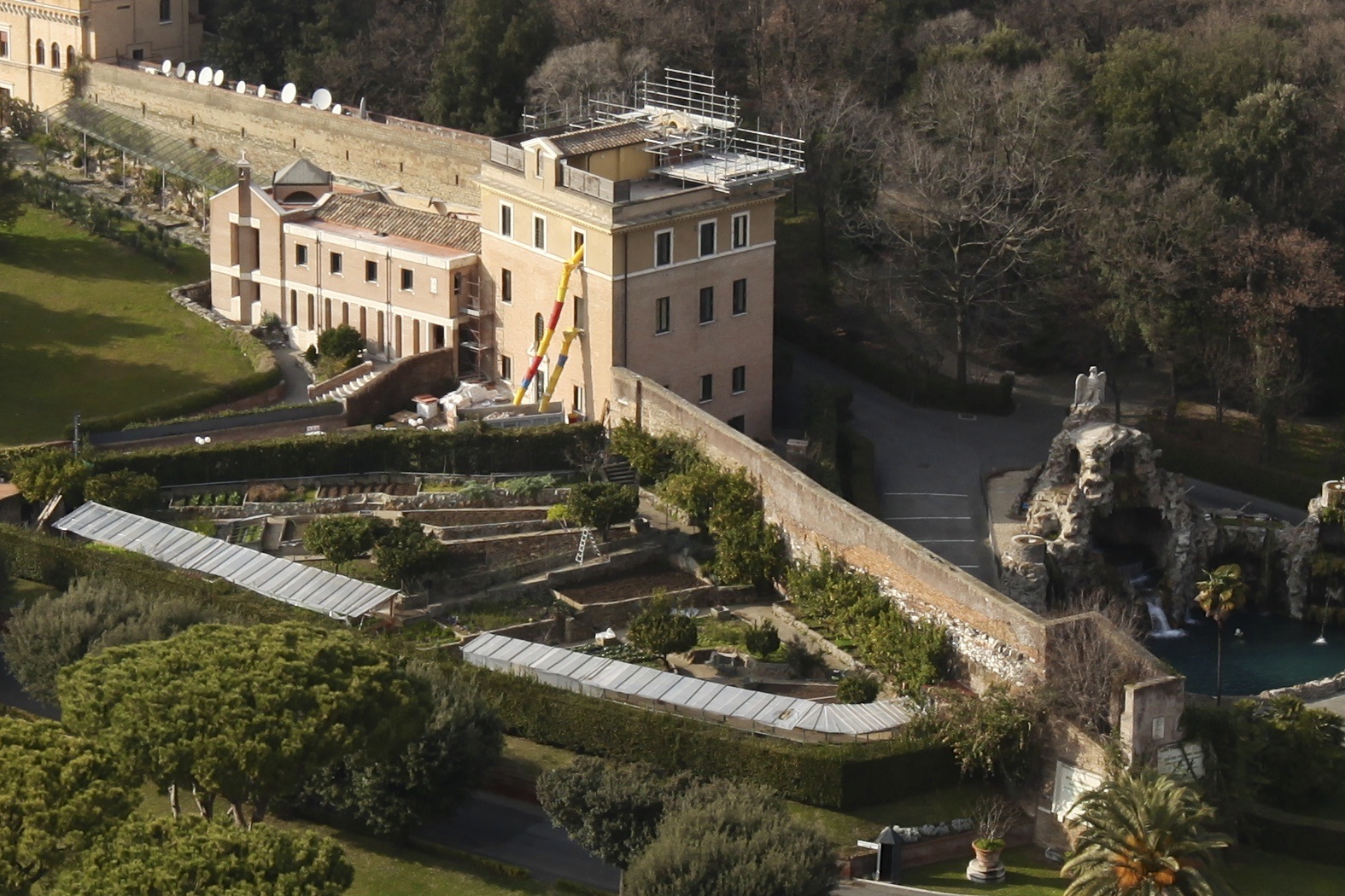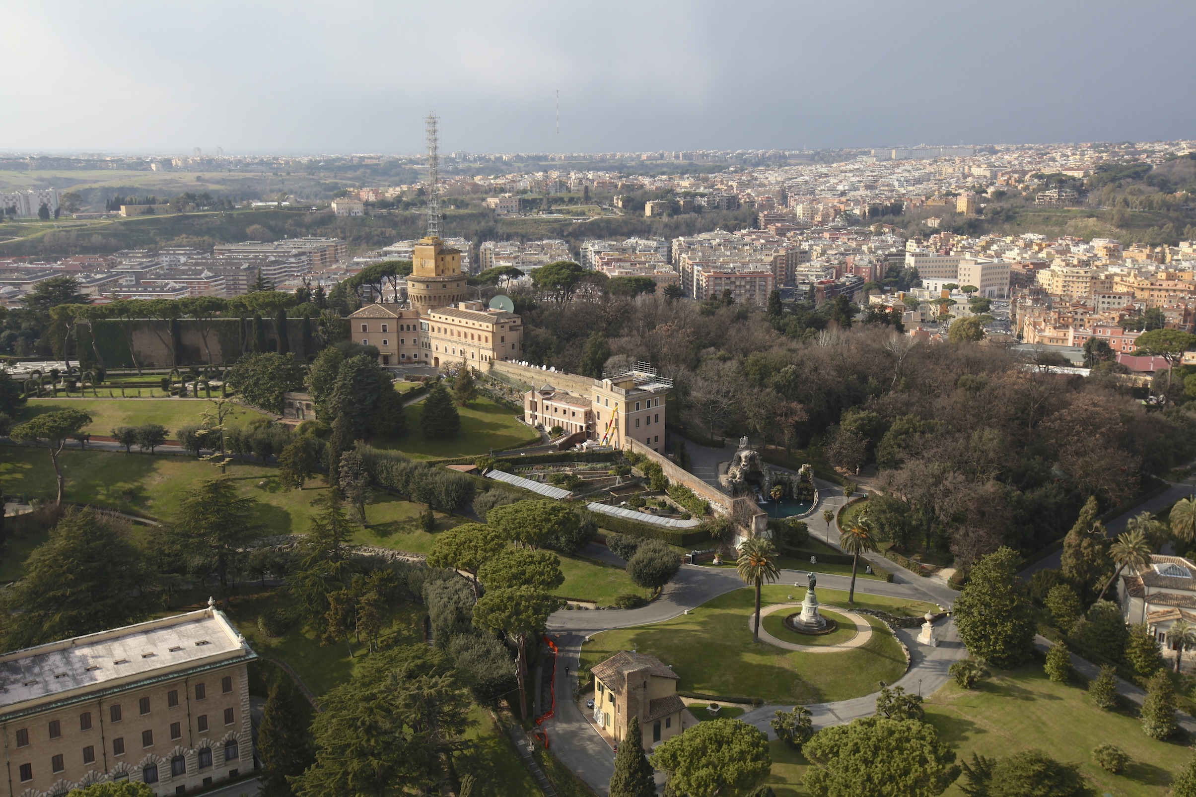 During their recent visit to Rome, the boys of the Schola Cantorum of the London Oratory School climbed the Dome of St Peter’s to see the spectacular views from the top of the Cupola. From there one can look into the Vatican Gardens and see the Mater Ecclesiae Convent, currently undergoing renovations and clearly distinguished by the builder’s chutes (centre of shot). The convent is being prepared for Benedict XVI as it is here that he will live for the rest of his days when he returns from Castel Gandolfo. The convent’s vegetable garden is visible in the foreground:
